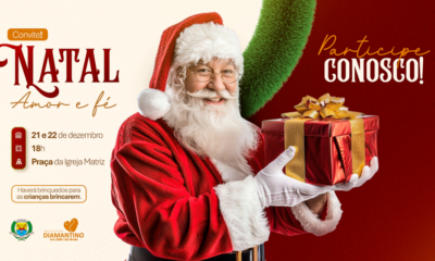 A Prefeitura de Diamantino realiza o Natal Amor e Fé nos dias 21 e 22 de dezembro, a partir das 18h, na Praça da Igreja Matriz....