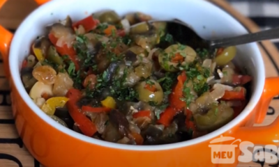 Ingredientes 2 berinjela 1 pimentão vermelho 1 pimentão amarelo pimenta biquinho a gosto uva passas e pimenta calabresa a gosto 1 cebola grande picada em tirinhas...