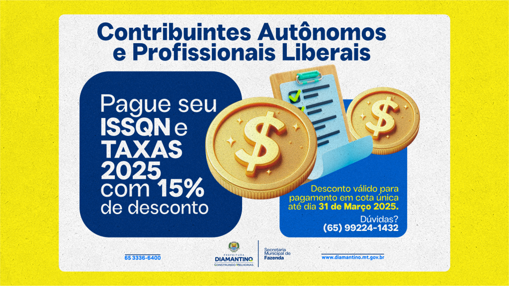 Com desconto de 15%, Prefeitura de Diamantino informa abertura de pagamento do Imposto sobre Serviços de Qualquer Natureza (ISSQN) aos contribuintes