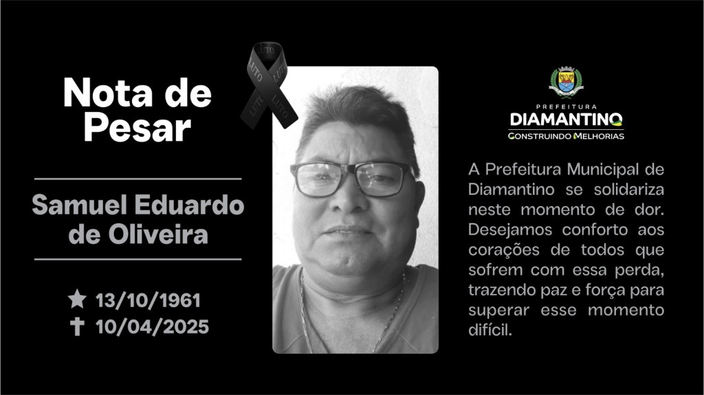 É com profundo pesar que a Administração Municipal de Diamantino comunica o falecimento do senhor Samuel Eduardo de Oliveira.