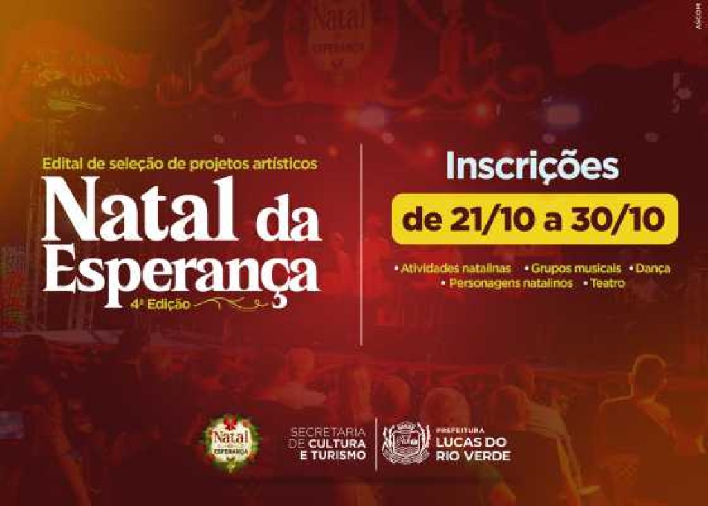 Conforme o Edital, a seleção é voltada para produções artísticas culturais nas áreas de música, dança, artes circenses, teatro e atividades natalinas para participação da programação cultural do Natal da Esperança, pela Secretaria de Cultura e Turismo.