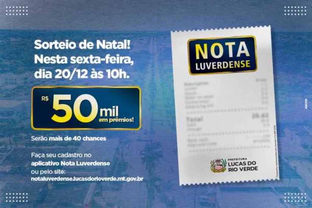 A campanha de incentivo a solicitação de Nota Fiscal de Prestação de Serviço Eletrônica (NFS-e), chega ao penúltimo sorteio, com a distribuição de mais R$ 50 mil em premiação. O sorteio da Nota Luverdense, edição de Natal, será antecipado para a próxima sexta-feira, dia 20 de dezembro, às 10h.