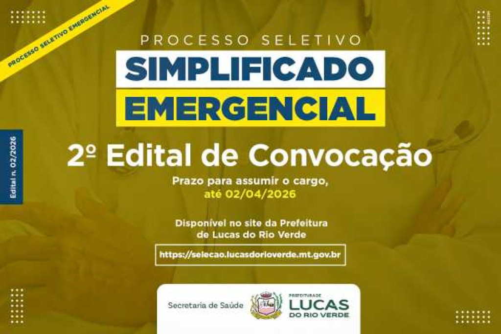 A Prefeitura de Lucas do Rio Verde divulgou nesta segunda-feira (06), dois novos editais de convocação de aprovados, nos Processos Seletivos Emergenciais n. 001/2026 e 002/2026.