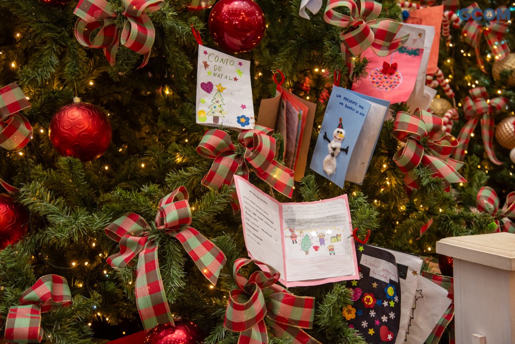 Livros dos alunos da Emei Elaine Aparecida são expostos em decoração natalina de shopping