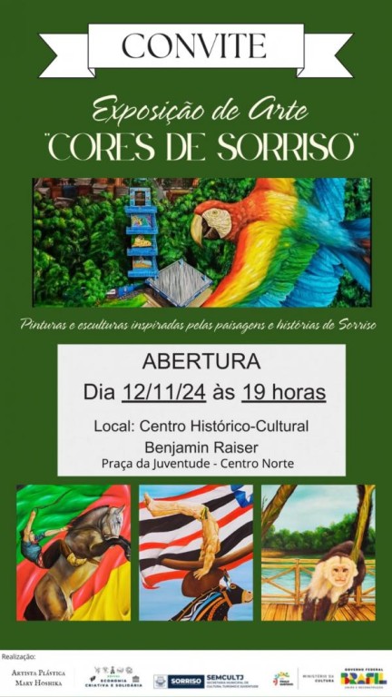 O secretário-adjunto da Secretaria de Cultura, Turismo e Juventude, Francisco Guimarães, também destacou a importância do projeto: “As exposições ‘Cores de Sorriso’ e ‘Cores do Mato Grosso’ convidam moradores e visitantes a mergulharem nas cores e histórias que compõem a identidade da cidade, contribuindo para um turismo que valoriza e reforça o caráter artístico local”, conclui.