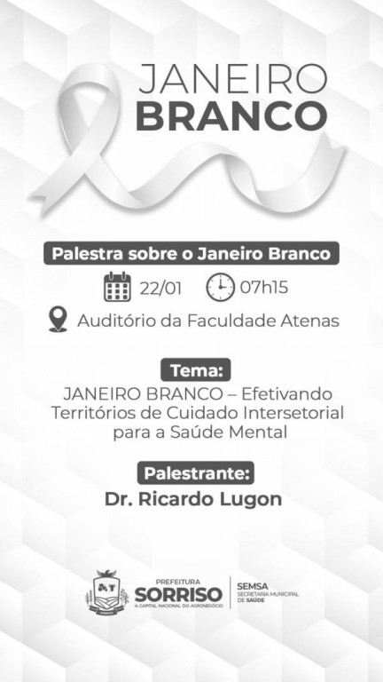 Sorriso promove, no dia 22 de janeiro, a partir das 7h15, no Auditório da Faculdade Atenas, uma palestra especial que integra o movimento nacional do Janeiro Branco. Além de simbolizar recomeços, o mês também convida a um olhar mais atento àquilo que não se vê: a saúde mental.