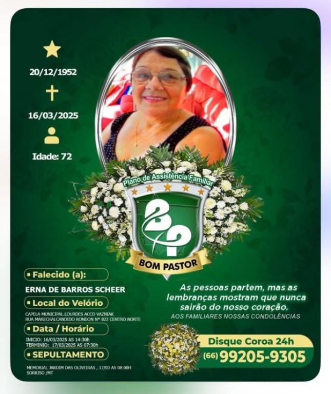 O velório está sendo realizado na Capela Municipal Lourdes Acco Wosniak (Sala Lírios), e o sepultamento será às 8h de amanhã (segunda-feira | 17 de março), no Memorial Jardim das Oliveiras.