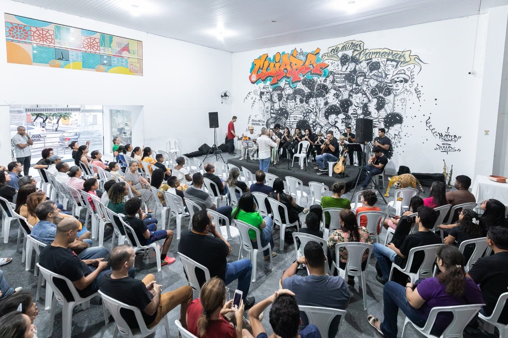 A imagem mostra a aula inaugural da Escola de Música de Cuiabá, realizada no salão de eventos da Secretaria Municipal de Cultura. Os alunos estão sentados, apreciando a apresentação da banda.