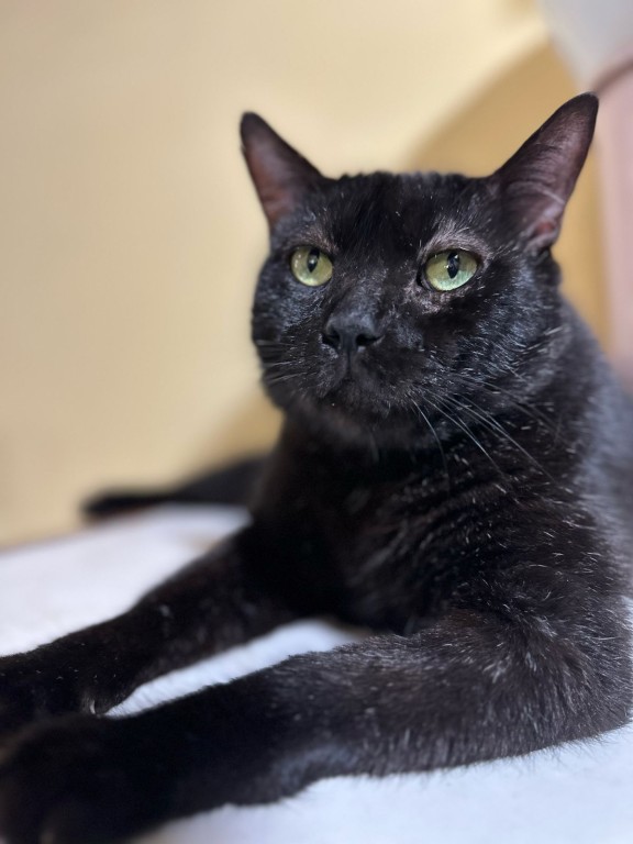 A foto exibe um gato de pelagem preta, chamado Lion, que é o mascote da Bem-Estar Animal da Prefeitura de Cuiabá. Ele é especial, tem sequelas nas pernas por conta dos maus tratos sofridos.