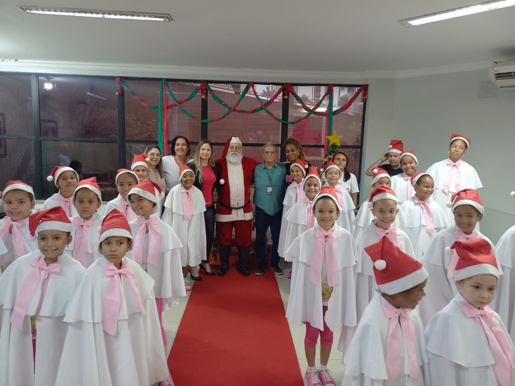 Nesta segunda-feira (17), o Hospital Municipal São Benedito (HMSB), em Cuiabá, recebeu uma apresentação especial do coral do Programa Siminina, promovida pela Prefeitura de Cuiabá por meio da Secretaria Municipal de Assistência Social, Direitos Humanos e da Pessoa com Deficiência. O evento trouxe alegria e emoção natalina tanto para os pacientes quanto para os colaboradores da instituição.