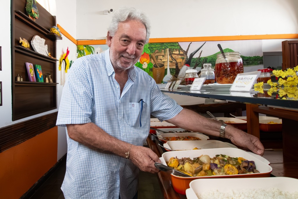 O proprietário do restaurante Regionalíssimo, Jean Biancardini, mostra a culinária cuiabana, uma travessa com prato típico. Ele está sorrindo, usa camisa branca e tem cabelo grisalho.