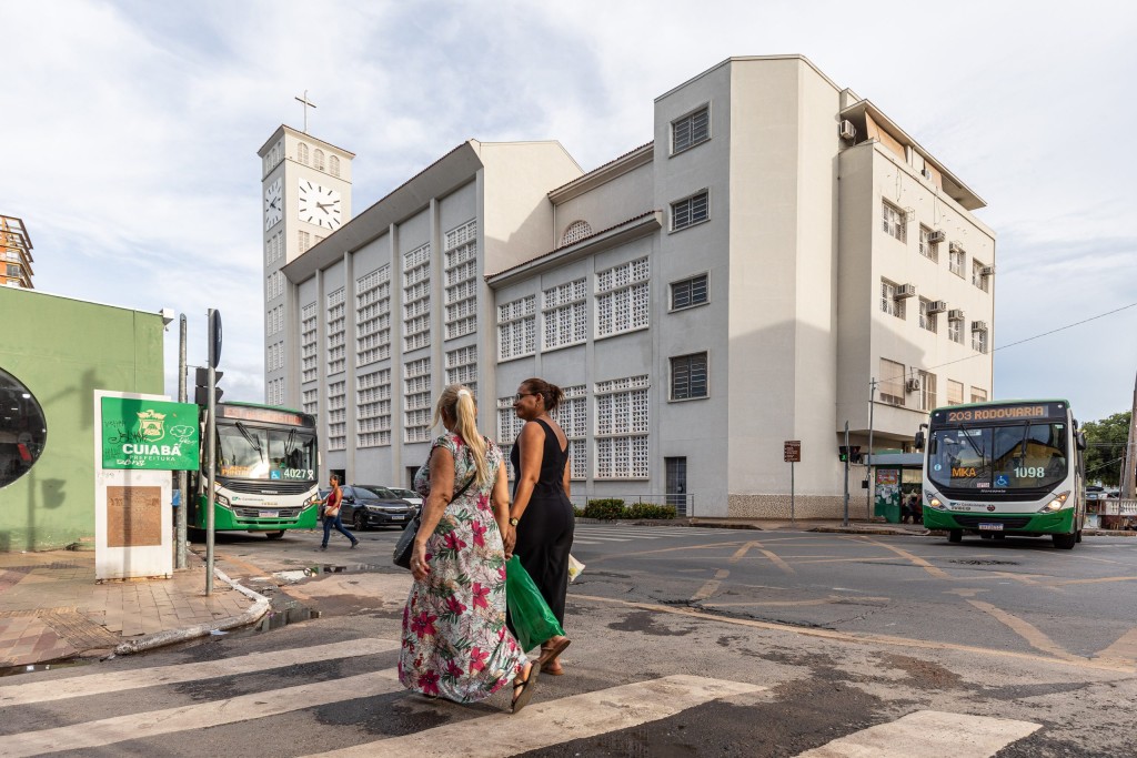 A foto mostra dois ônibus circulando na região central de Cuiabá. Na composição há pedestres atravessando em faixa e Catedral Basílica do Senhor Bom Jesus ao fundo.