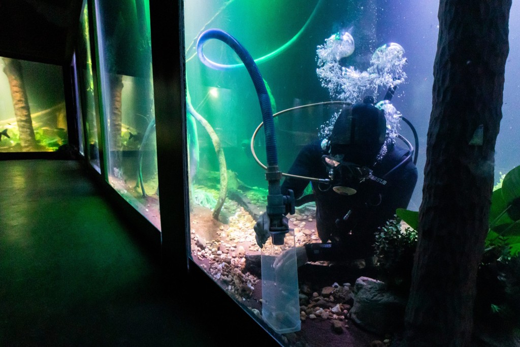 “É um trabalho diário, de segunda a segunda. Na segunda-feira, essa manutenção é mais rigorosa. Os equipamentos permanecem em funcionamento e, caso seja necessário realizar algum reparo, ele é feito. Nossa análise é constante: coletamos amostras de água para realizar as correções necessárias e fazemos a manutenção dos habitats”, explicou.
