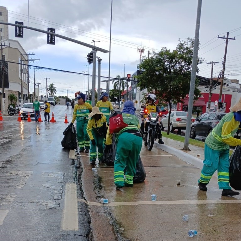A imagem mostra colaboradores da Limpurb, durante limpeza na avenida Mato Grosso, Centro de Cuiabá.