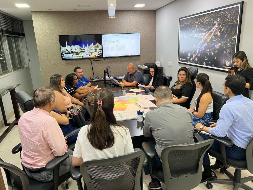 A imagem mostra uma ampla mesa de reunião no gabinete do prefeito, composta por equipes da Prefeitura de Cuiabá. Liderando a agenda, o prefeito Abilio com sua tradicional camisa cinza.