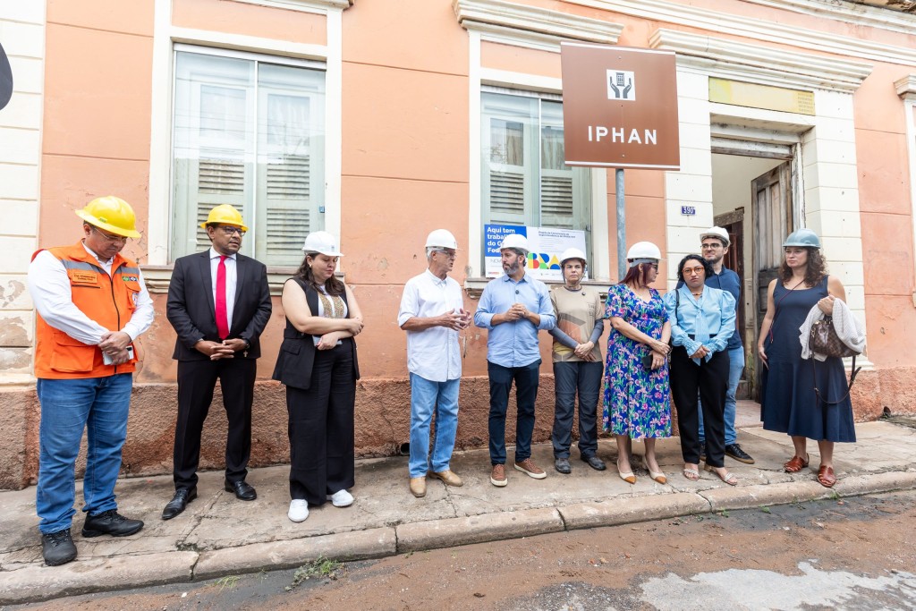 A imagem mostra as autoridades posicionadas em frente a sede do Iphan no Centro Histórico de Cuiabá, para anúncio da reforma do prédio.