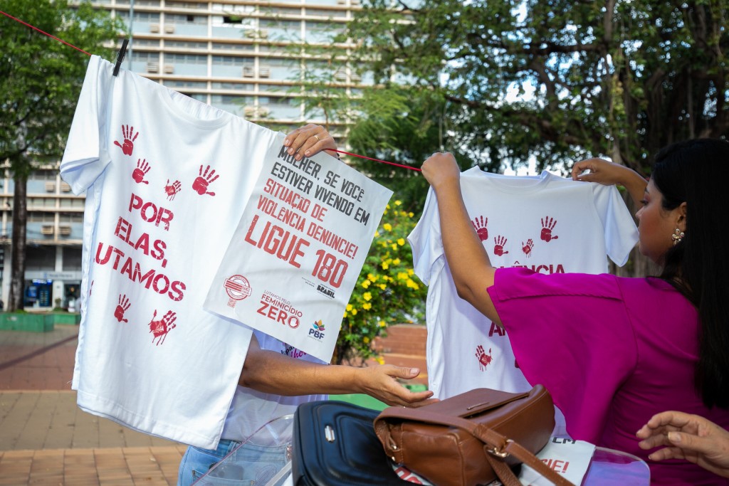 Na tarde desta segunda-feira (25), a Praça Alencastro recebeu o “Varal da Luta”, uma exposição simbólica em alusão ao Dia Internacional pela Eliminação da Violência contra a Mulher, celebrado em 25 de novembro. O ato apresentou camisetas brancas marcadas com mãos vermelhas e frases impactantes sobre a violência de gênero, reforçando o compromisso de Cuiabá com essa importante causa. A ação foi realizada pela Prefeitura de Cuiabá, por meio da Secretaria Municipal da Mulher e primeira-dama de Cuiabá, Márcia Pinheiro.