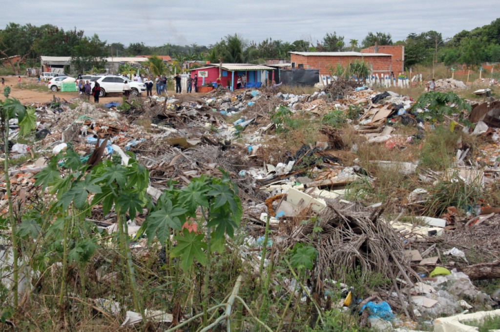 A imagem mostra um terreno baldio, tomado por mato e lixo.