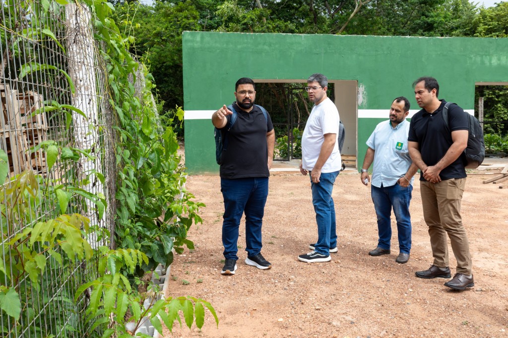 A foto mostra os secretários municipais de Turismo, Fernando Medeiros, e o de Agricultura, Trabalho e Desenvolvimento Econômico, Fellipe Corrêa, em vistoria nas proximidades da área de preservação ambiental no Mercado do Porto, em Cuiabá. Eles estão acompanhados de outras duas pessoas que fazem parte da equipe de trabalho. Atrás da equipe há uma estrutura de concreto na cor verde que é onde ficam as lixeiras e na parte lateral é uma tela que faz a divisa do Mercado com a área de preservação. A tela está praticamente coberta por plantas verdes.