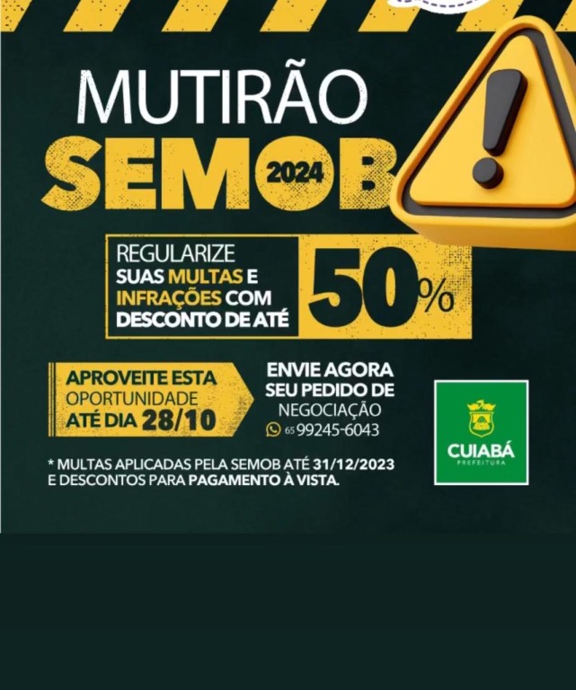 O Mutirão Fiscal oferece desconto de até 50% no pagamento de multas de trânsito, e os acordos podem ser feitos de forma totalmente virtual por meio do WhatsApp. A iniciativa é coordenada pela Procuradoria Geral do Município (PGM), em parceria com o Tribunal de Justiça de Mato Grosso (TJMT). Também é possível realizar o procedimento online pelo portal: https://refis.cuiaba.mt.gov.br/portal/Refis/Home.aspx.