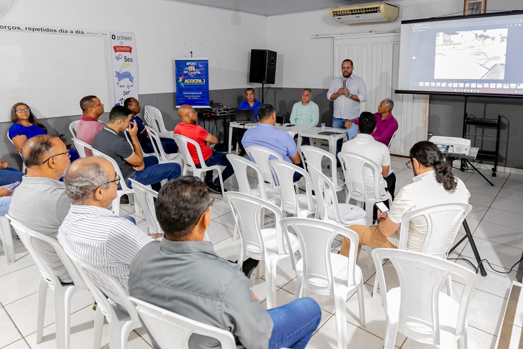 A imagem mostra a reunião com diversas pessoas, no Centro Comunitário do bairro CPA I. Liderando a fala está o secretário Reginaldo e equipe da Secretaria de Obras.