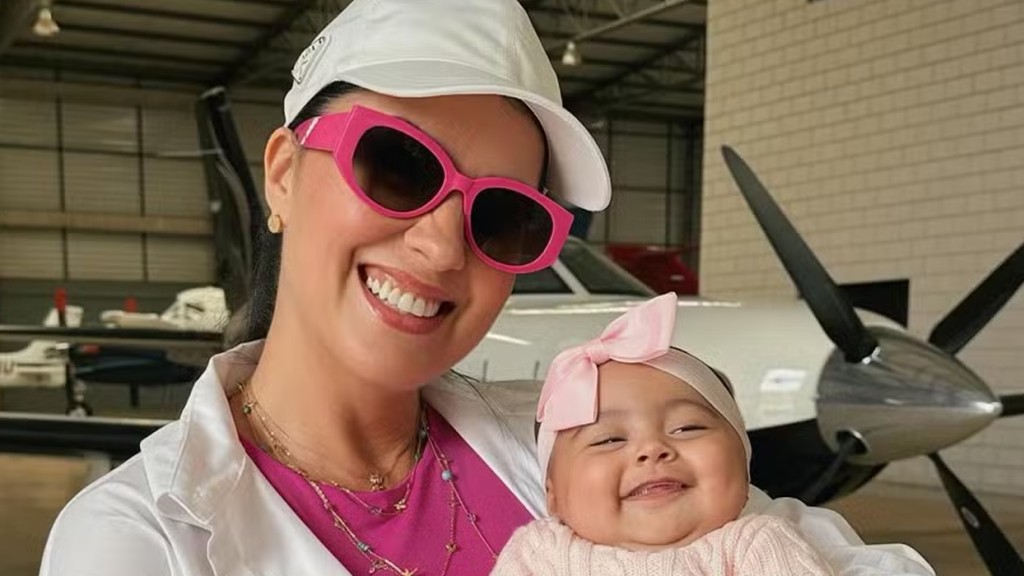 Caçula de Zezé esbanja sorrisos ao pegar jatinho com a mãe: ‘Conhecer Cuiabá!’