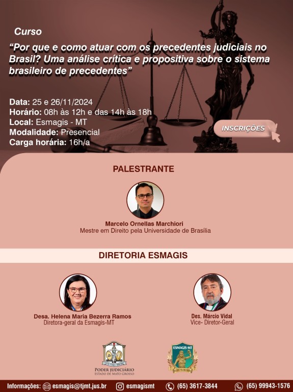 Atenção, magistrados(as) e assessores(as) do Poder Judiciário de Mato Grosso! Estão abertas as inscrições para o curso ‘Por que e como atuar com os precedentes judiciais no Brasil? Uma análise crítica e propositiva sobre o sistema brasileiro de precedentes’, que será ofertada presencialmente pela Escola Superior da Magistratura de Mato Grosso (Esmagis-MT) nos dias 25 e 26 de novembro, das 8h às 12h e das 14h às 18h. Fonte: Tribunal de Justiça de MT – MT