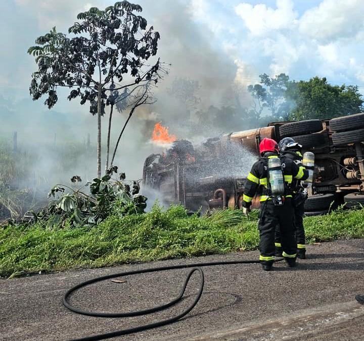Corpo de Bombeiros socorre vítima e combate incêndio em carreta após acidente na BR-070
