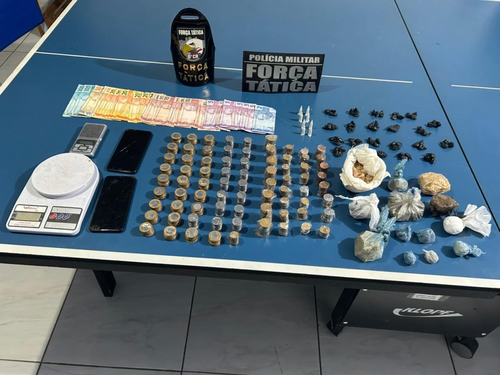 Durante as buscas pela casa, foram encontradas seis porções grandes de pasta base, cinco porções de maconha, 82 porções de cocaína, uma balança digital, dois celulares, uma caixa de som, e uma quantia em dinheiro nos valores de R$ 425,95 em moedas e R$827 em espécie.