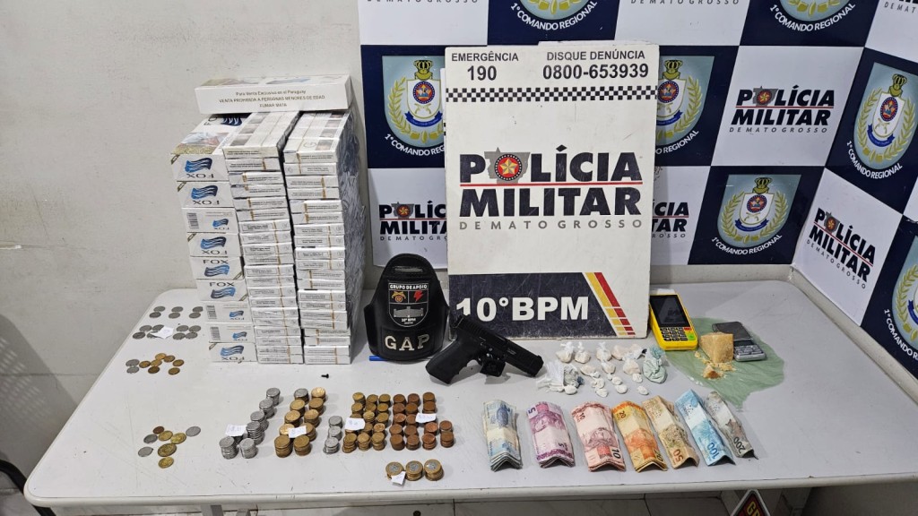 Um homem, de 37 anos, foi preso pela Polícia Militar por crime de contrabando e tráfico de drogas, na noite desta quarta-feira (23.10), em Cuiabá. Na ação, a PM apreendeu porções de cocaína, cigarros de origem paraguaia e um simulacro de arma de fogo.