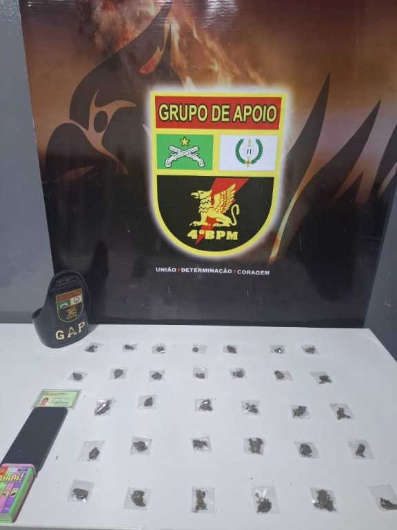 Com eles, foram apreendidas 32 porções de maconha, um aparelho celular e uma balança de precisão. A dupla e os ilícitos foram encaminhados à delegacia para registro do boletim de ocorrência.