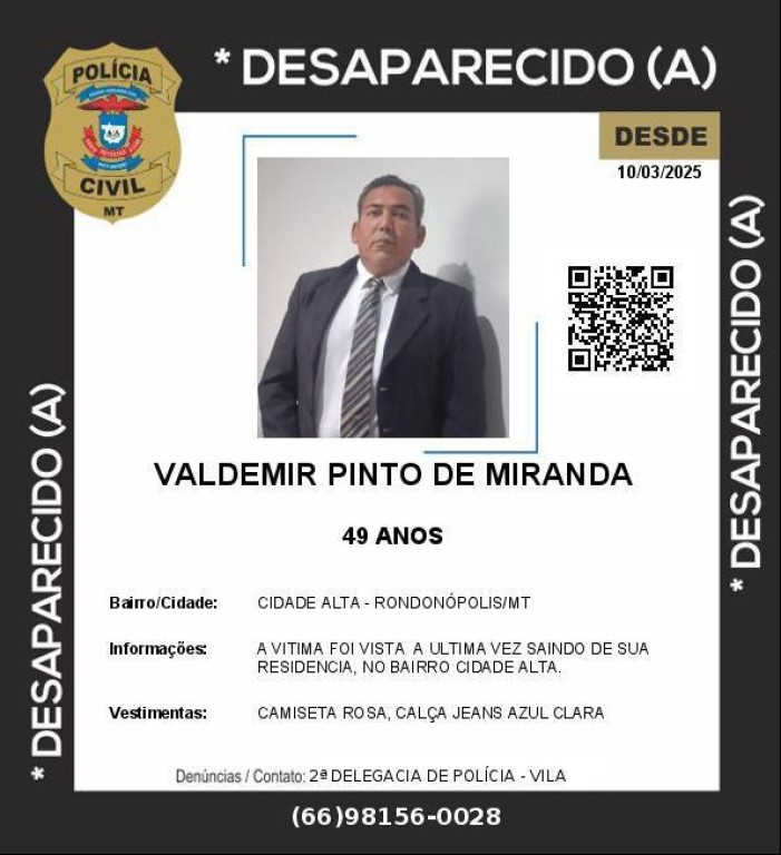 A Polícia Civil segue com as investigações e busca por mais informações que possam levar ao paradeiro de Valdemir Pinto de Miranda. Qualquer informação pode ser repassada pelo telefone (66) 98156-0028.