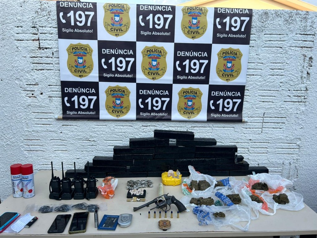 Mais de 23 quilos de entorpecentes, uma arma de fogo e outros materiais de origem ilícita foram apreendidos pela Polícia Civil, na tarde de quinta-feira (17.10), em uma ação conjunta do Núcleo de Inteligência da Delegacia de Tangará da Serra e Delegacia de Barra do Bugres.