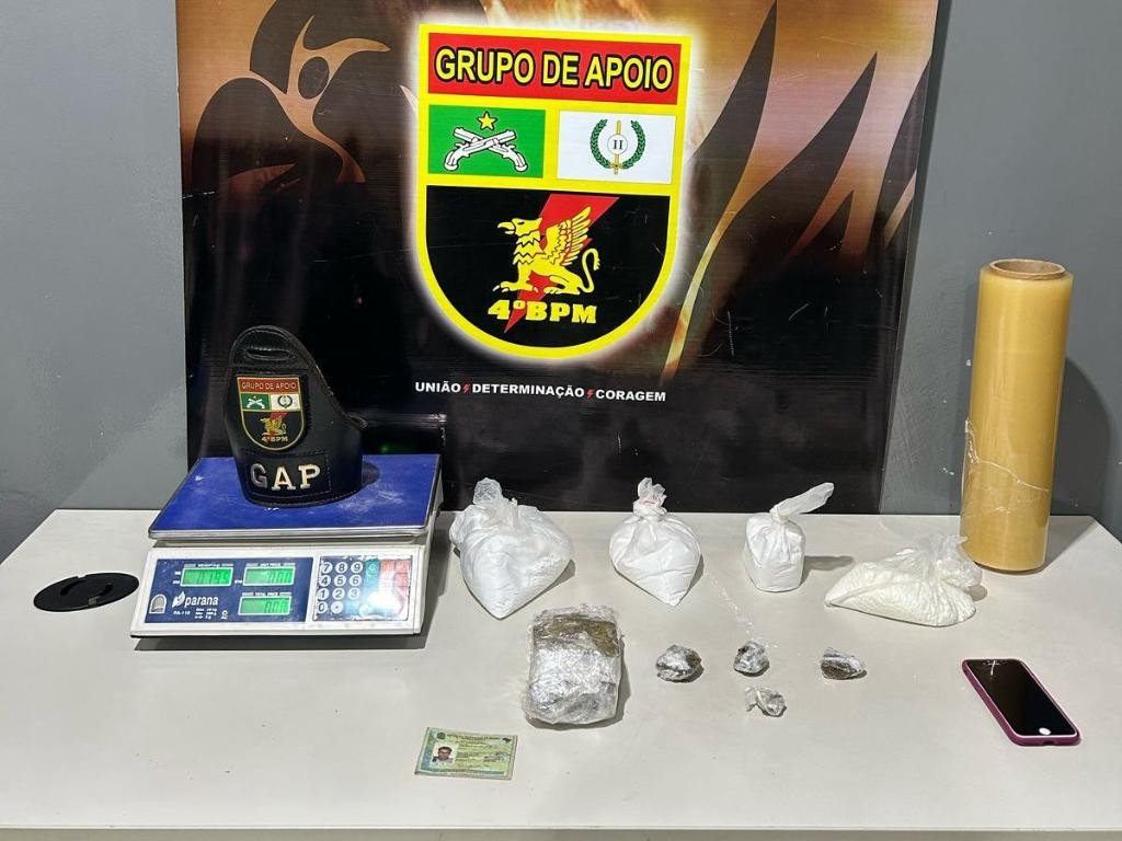 Os militares fizeram buscas pela casa e encontraram o tablete de maconha e os pacotes com cocaína, além de uma balança e materiais para embalar as drogas.
