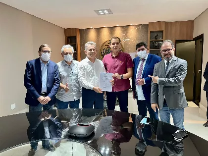 O governador Mauro Mendes (UB), o secretário-chefe da Casa Civil, Mauro Carvalho, o secretário estadual de infraestrutura e logística, Marcelo de Oliveira, o Marcelo Padeiro, o prefeito do município, Luís Fernando (UB) e o deputado estadual Paulo Araújo (PP), participaram da solenidade de assinatura dos convênios.