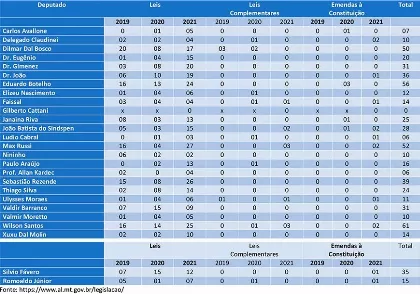 Deste total, 55 são leis; 4 leis complementares,; 622 projetos de lei; 12 projetos de lei complementar,;7 propostas de emenda à Constituição e 2 emendas à Constituição.